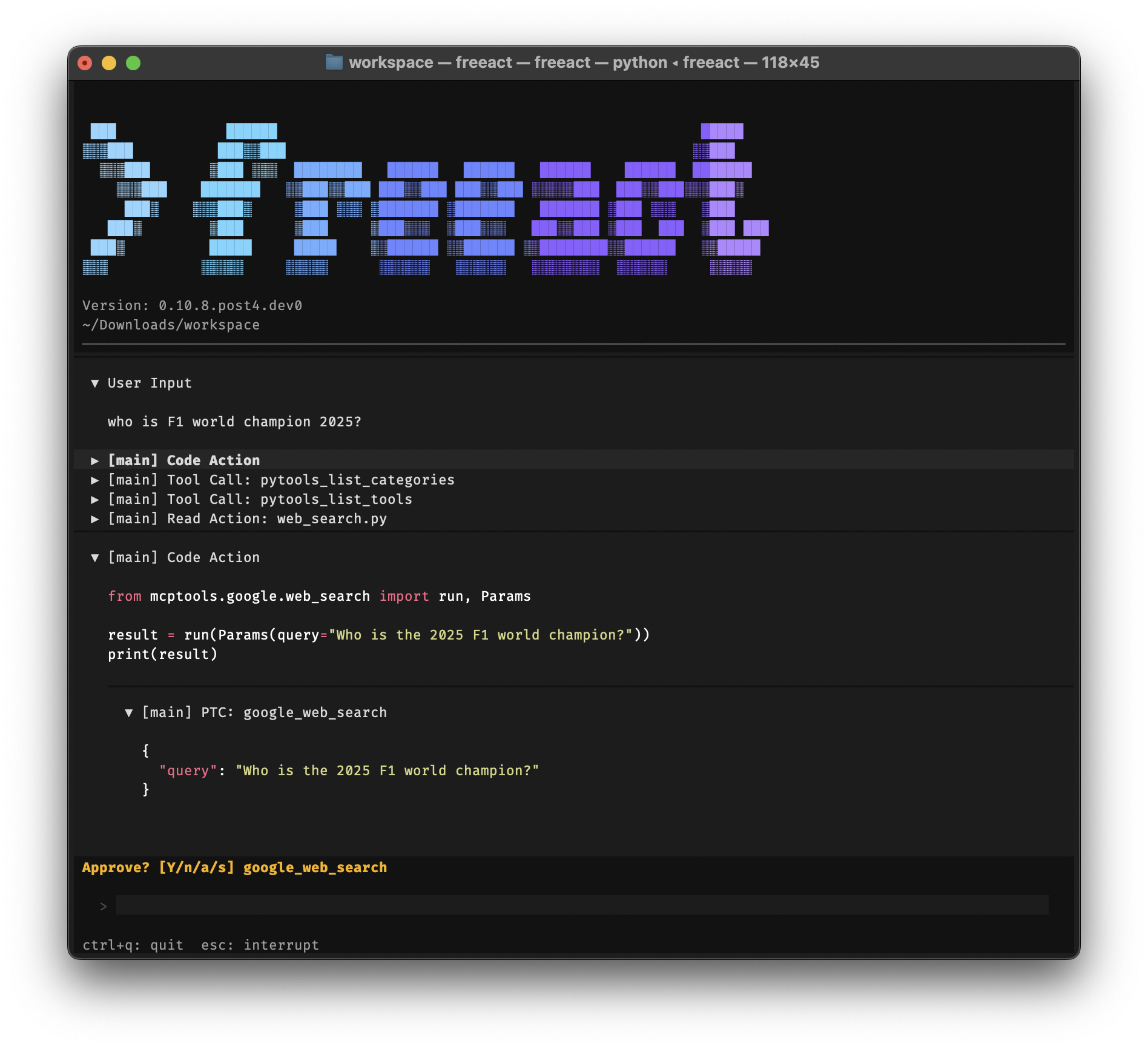 Freeact can prompt for approval before running code actions. Shell commands and programmatic tool calls within code actions are intercepted during execution and approved individually. The screenshot below shows the approval prompt for a programmatic tool call (PTC):