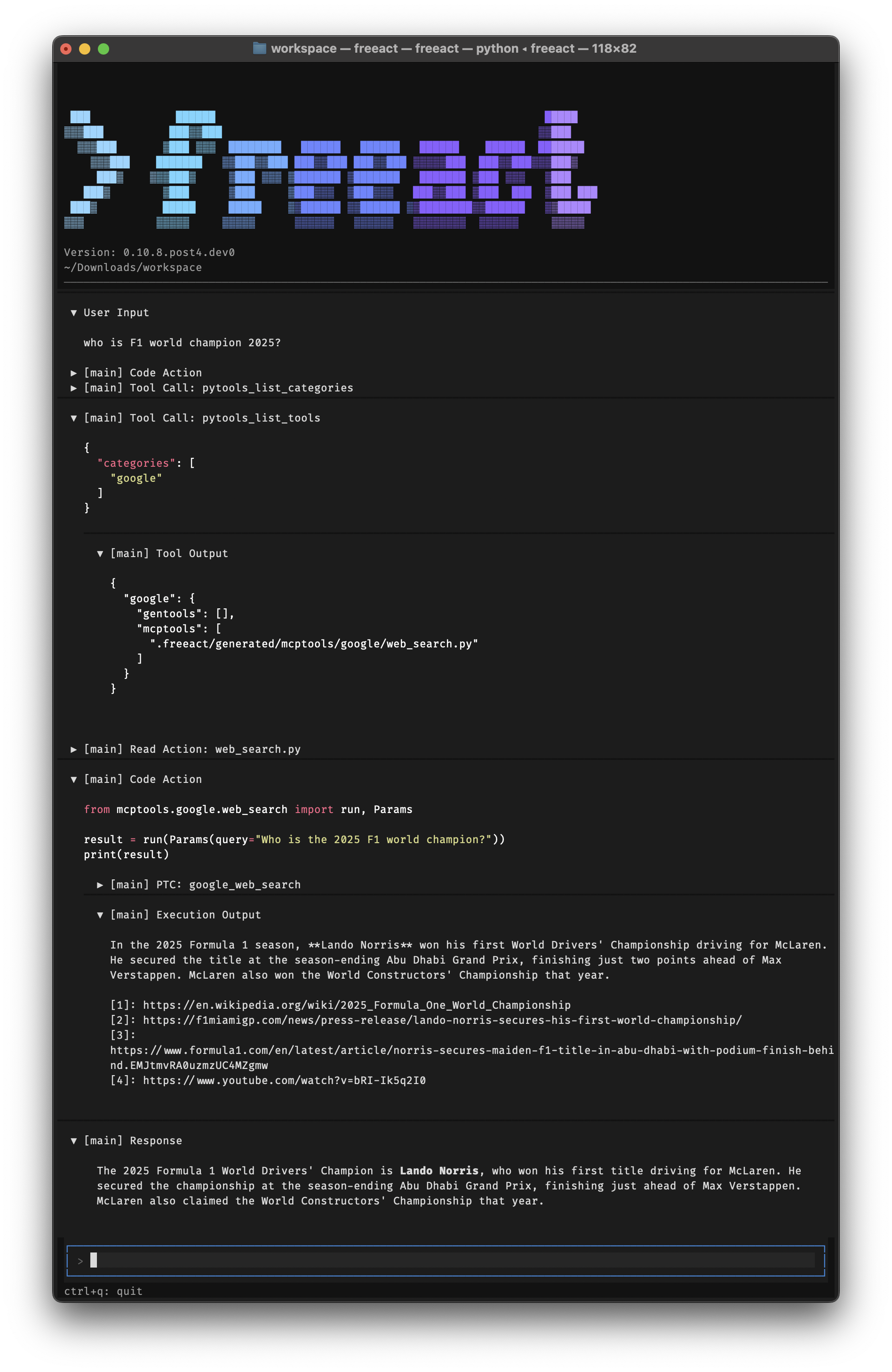 Freeact provides a CLI tool for running the agent in a terminal.